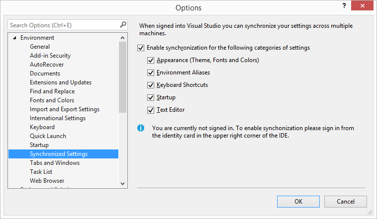 转到Tools > Options > Environment > Synchronized Settings为该计算机上的不同设置类别打开或关闭同步。
