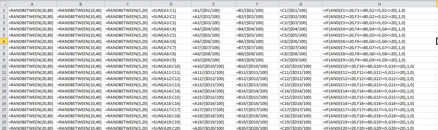 如果你这样做,E到G列就是你的随机数。列H是一个检查,以确保您的约束在缩放后仍然满足。这样做对宏解决方案的好处是计算效率,因为大约80%的尝试结果是满足约束条件,而不是宏方法,而宏方法只产生略多于1%的结果。当然,这个缩放逻辑可以在宏中完成,但是这里是工作表函数。