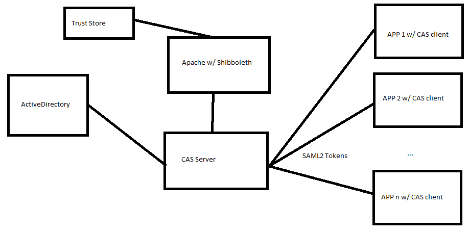 如您所见,每个应用程序都使用CAS客户端连接到CAS服务器。这个服务器还有带有Shibboleth插件(?)的Apache。配置。这个CAS服务器然后与我们的Active Directory ("AD")服务器进行通信。