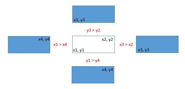 现在,如果这四个条件中的任何一个是正确的,我们可以得出结论,矩形不是重叠的: