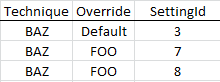 techniqueSettings.Add(new TechniqueSettings { Id = 2, Override = "Default", SettingKeyId = 4, Technique="BAZ"});