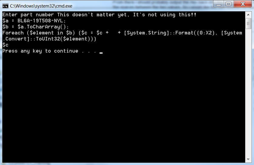 Foreach ($element in $b) {$c = $c + " " + [System.String]::Format("{0:X2}", [System.Convert]::ToUInt32($element))}我尝试使用这个网站http://learningpcs.blogspot.com/2009/07/powershell-string-to-hex-or-whatever.html的规则来允许它在我的批处理文件中工作。这就是我得到的。