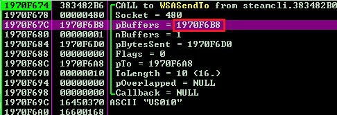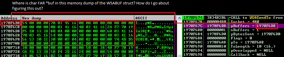 我认为您应该能够只需右键单击指针,并选择“跟随在转储”。然后,您可以在转储中选择4字节的布局,并通过相同的过程再次遵循buf指针。注意,__WSABuf结构中的第一个单词是长度,所以您需要第二个单词(在本例中,地址是0x16450370)。