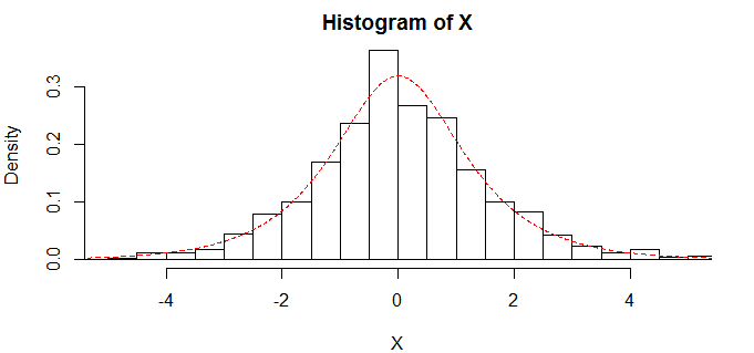 hist(X, freq=F, breaks=50, xlim=c(-5,5))
