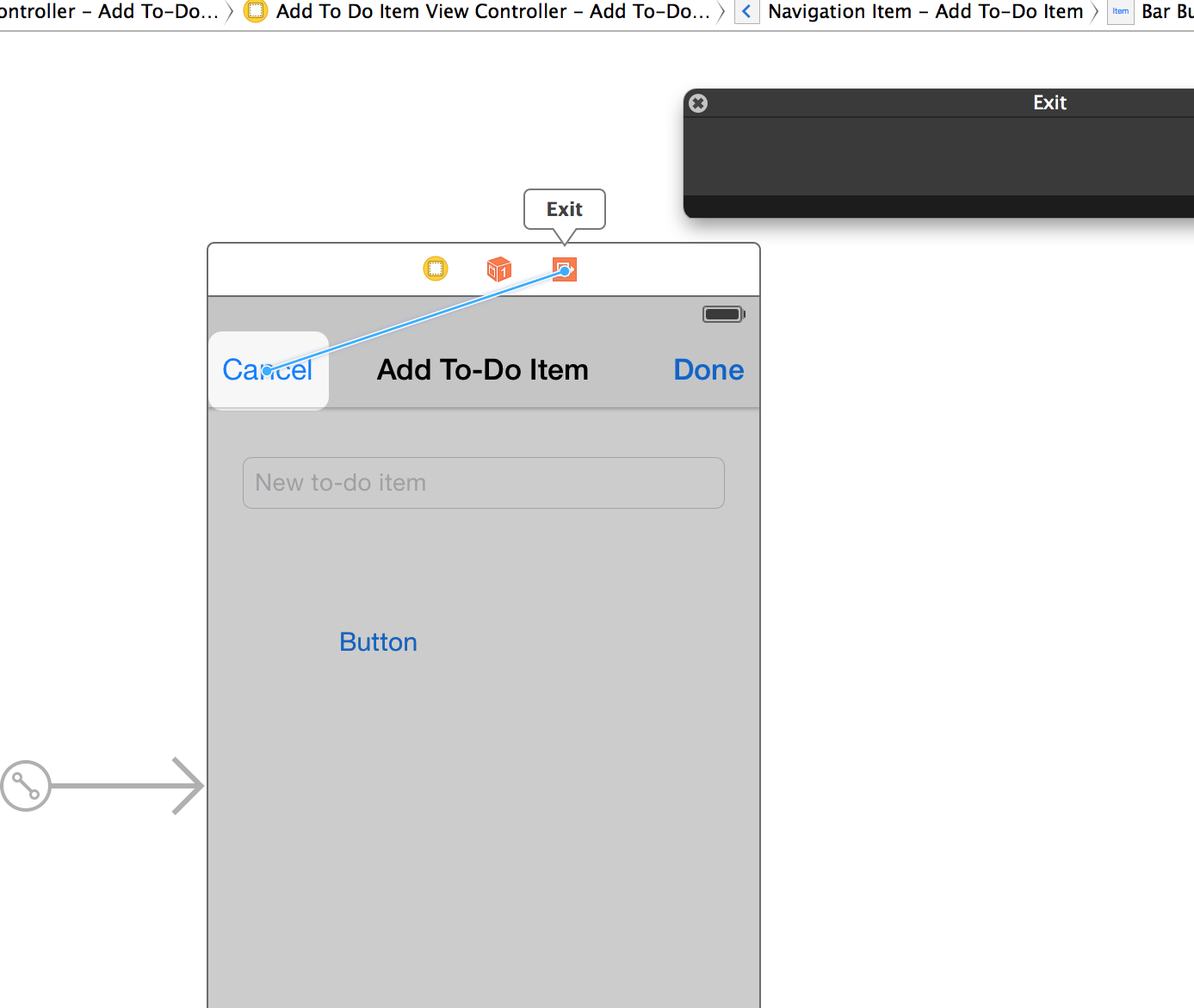 我终于能够让它开始工作了;xcode6 IB现在真的很脆弱(崩溃也很多)。在将导航条按钮项连接到退出项之前,我必须重新启动IDE。最后,我重新创建了我的测试项目,并遵循了上述建议(Xcode 6发行说明PDF,第10页),以使其工作。此外,在添加.h文件时,我确保选择了默认未选中的项目目标。我还创建了我的控制器快速存根通过Cocoa类模板(vs空的快捷文件)。我在导航控制器上使用了模态导航。