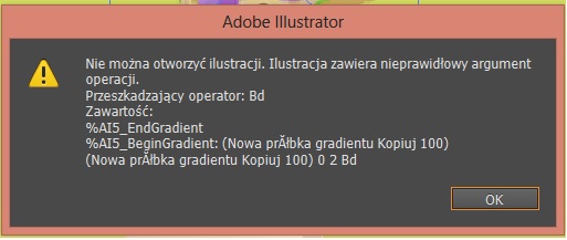 我遇到了一个错误,在这种情况下,使用渐变有时会破坏插画文件。当我打开它时,我会看到bug弹出(是的,我使用了Illustrator CC的波兰本地化版本)。