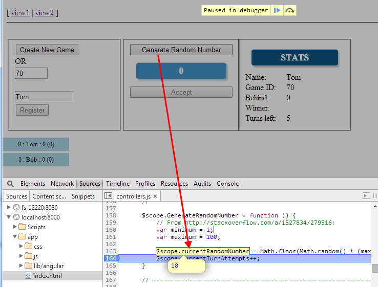 这个想法是每个玩家点击一个按钮来生成一个介于1-100之间的随机数。Tom (下面的截图),在JavaScript中放置一个断点,每次将这个数字更改为99。