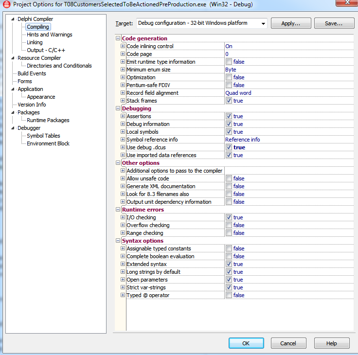 我在调试构建配置中编译了一个测试应用程序,生成了相关的详细地图文件,并将“使用调试.dcus”选项设置为true。下面是编译器配置的截图。