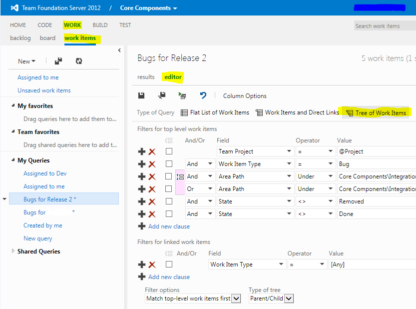 为了构建Dylan的答案,下面是如何将工作项查询转换为基于树的表单(因此您可以添加一个树级)。这适用于2012及更高版本。