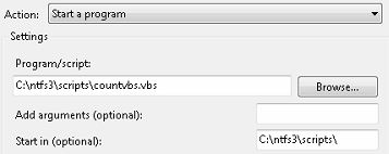 尝试您的程序/脚本为c:\windows\syswow64\cscript.exe,甚至是c:\windows\system32\cscript.exe,然后将参数设置为c:\path_to_your_vbs\your.vbs
