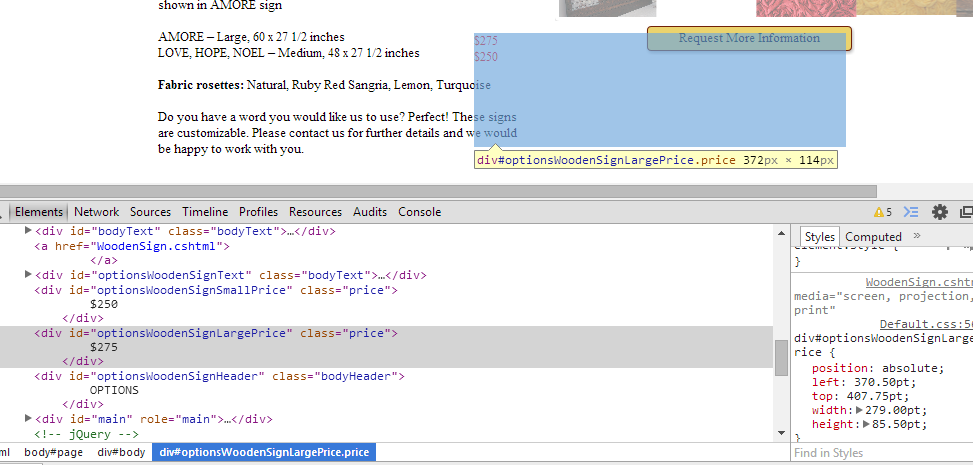但是,从div#optionsWoodenSignLargePrice样式中删除宽度和高度属性确实解决了您的问题。