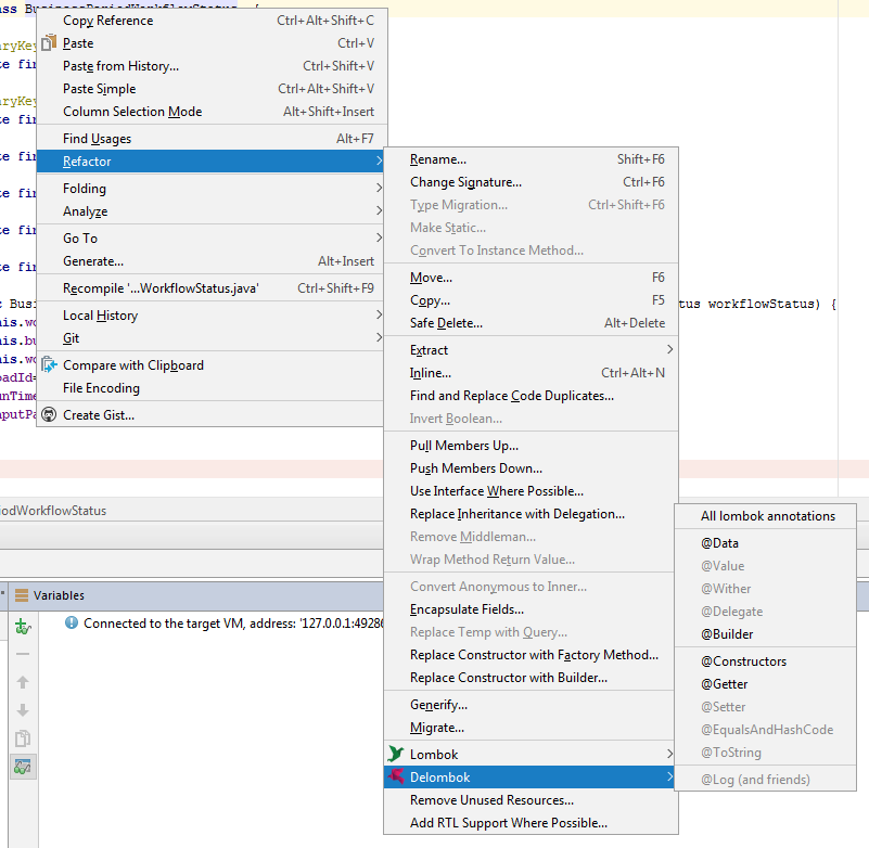 断点作用于隐式函数。delombok特性允许生成隐式实现(调试后可以/应该恢复原始更改)。要实现隐式实现,只需右键单击类名并选择以下菜单项:
