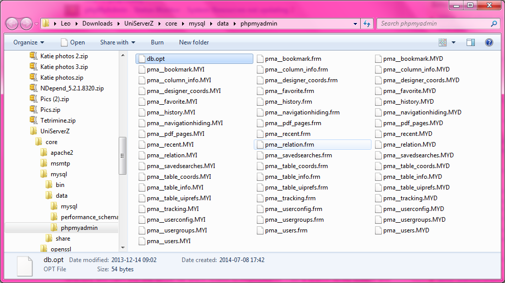 我试着选择"db.opt",但根据Netbeans的说法,这不是正确的文件。我应该在这张表格上写些什么?哪个文件对应于PhpMyAdmin,如果我安装了UniServer,那么在我的系统中应该能在哪里找到它呢?