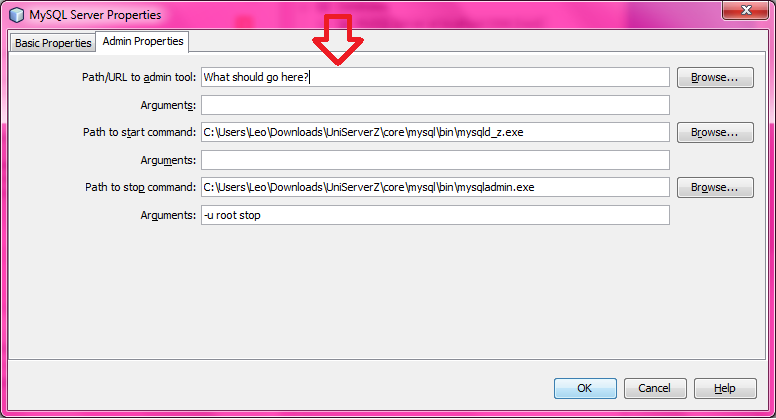 我建议将其设置为UniController.exe ( UniServer安装的顶层文件夹中的its)。通过该工具,您可以启动/停止服务器,它有一个按钮来打开PhpMyAdmin控制台。