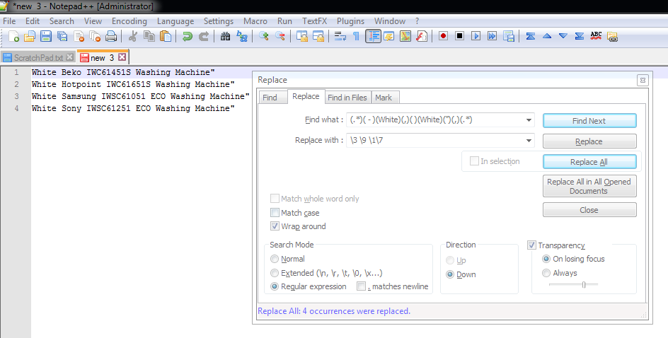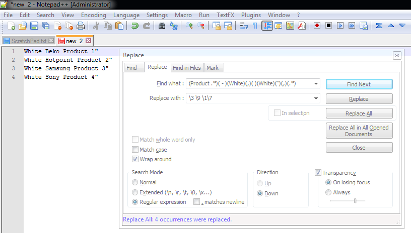 Find What --> (Product .*)( - )(White)(,)( )(White)(")(,)(.*)