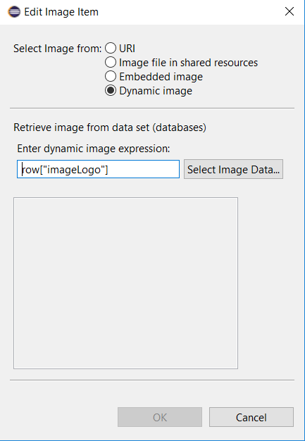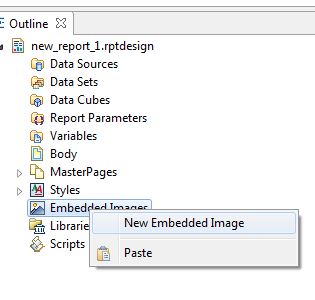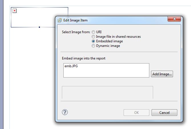 您可以看到如何向报表文件中添加图像。完成后,将显示小红图标的图像元素与嵌入的图像绑定。通过双击report上的image元素并从对话框中选择embedded image来实现这一点。