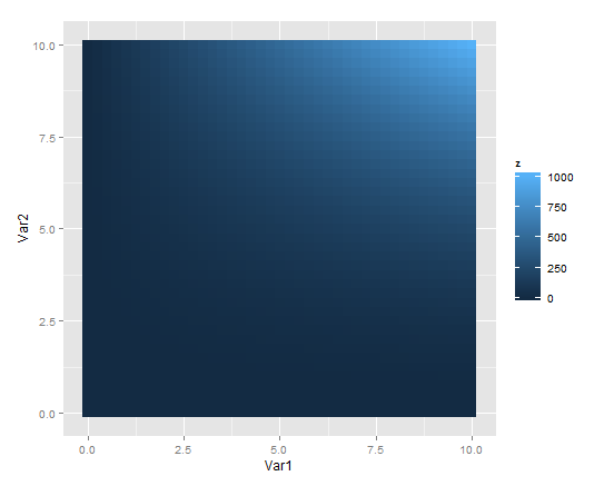 ggplot(df) + geom_tile(aes(x=Var1, y=Var2, fill=z))