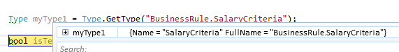 Type myType1 = Type.GetType("BusinessRule.SalaryCriteria");