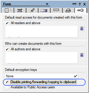 克努特描述的$KeepPrivate项可能存在于ACL设置而不是窗体设置。每个ACL条目上都有一个标记为“复制或复制文档”的设置。没有启用此设置的用户将无法复制文档,但是有一个副作用是在这个IBM Technote中描述的。也就是说,当具有此ACL设置的用户创建文档时,这些文档将被标记为$KeepPrivate项。这样可以防止每个人复制文档,甚至那些没有在自己的ACL条目中签入该框的人也是如此。IBM并不认为这是一个bug。我认为这是设计上的缺陷。