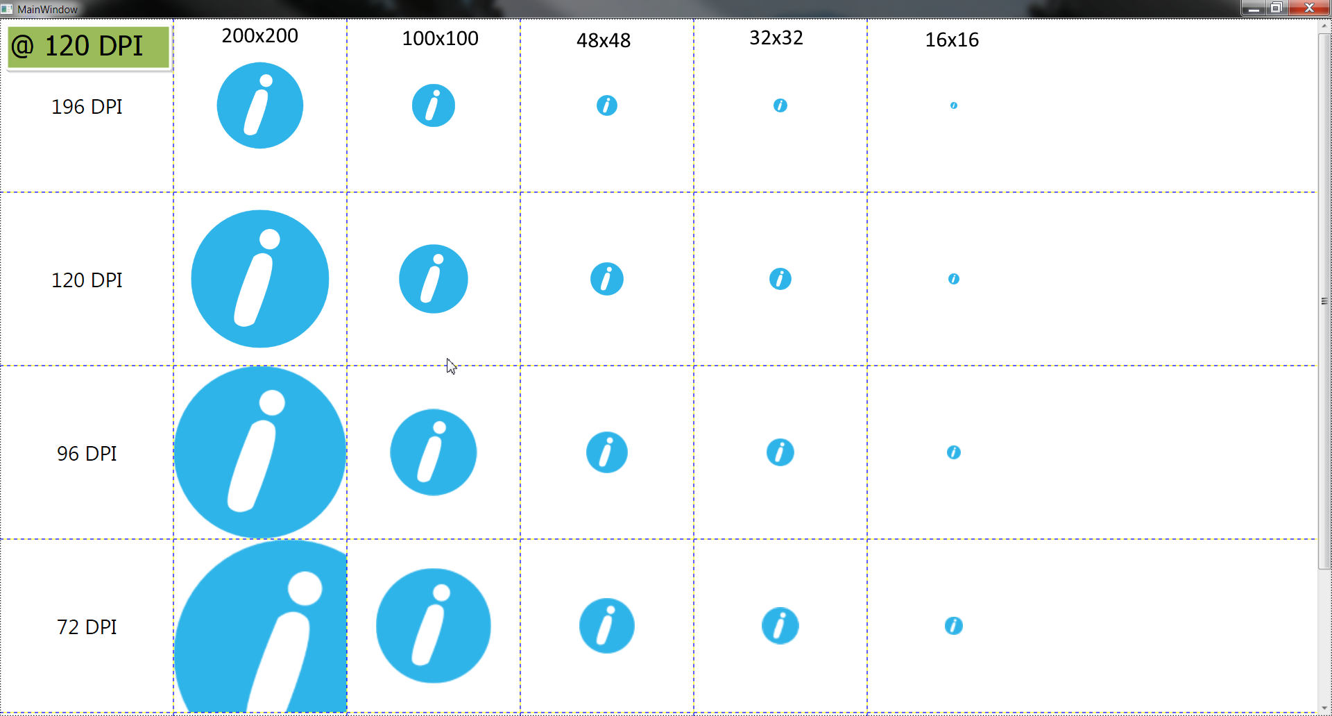 第二个尺度因素,“DPI设置”,是我们在测试中将有所不同的因素。WPF并不独立地知道监视器的实际物理DPI值是什么。相反,WPF使用第二个比例因子的当前设置“DPI设置”。如果“DPI设置”与真实的物理DPI不匹配,那么WPF的“决议独立性”就会出现中断--尽管它实际上并非如此。 http://www.wpflearningexperience.com/?p=41