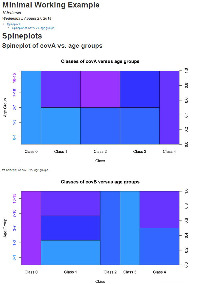 ,我试图创建一系列的图表,比较一些潜在的协变量与年龄类别,以便我们可以做一些初步的数据探索。我用RStudio编写了这段代码,我使用RStudio将文件编织成一个HTML。但是,我很难让循环生成的每个地块都有一个适当的RMarkdown头。我尝试过将cat("## my header")