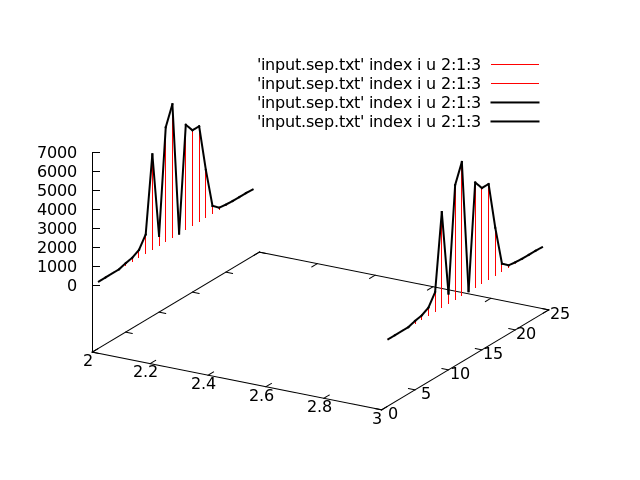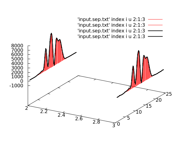 splot for [i=1:words(colors)] 'input.sep.txt' index i u 2:1:3 w lines lc rgb word(colors,i)这条线是毫无问题地画出来的,我相信他们画得是正确的。我的问题是:如何在直线下面填充,使其看起来像一个实心墙(即,一直到0z值)?我尝试使用w pm3d,但是这实际上并没有在轴上显示任何可见的东西。