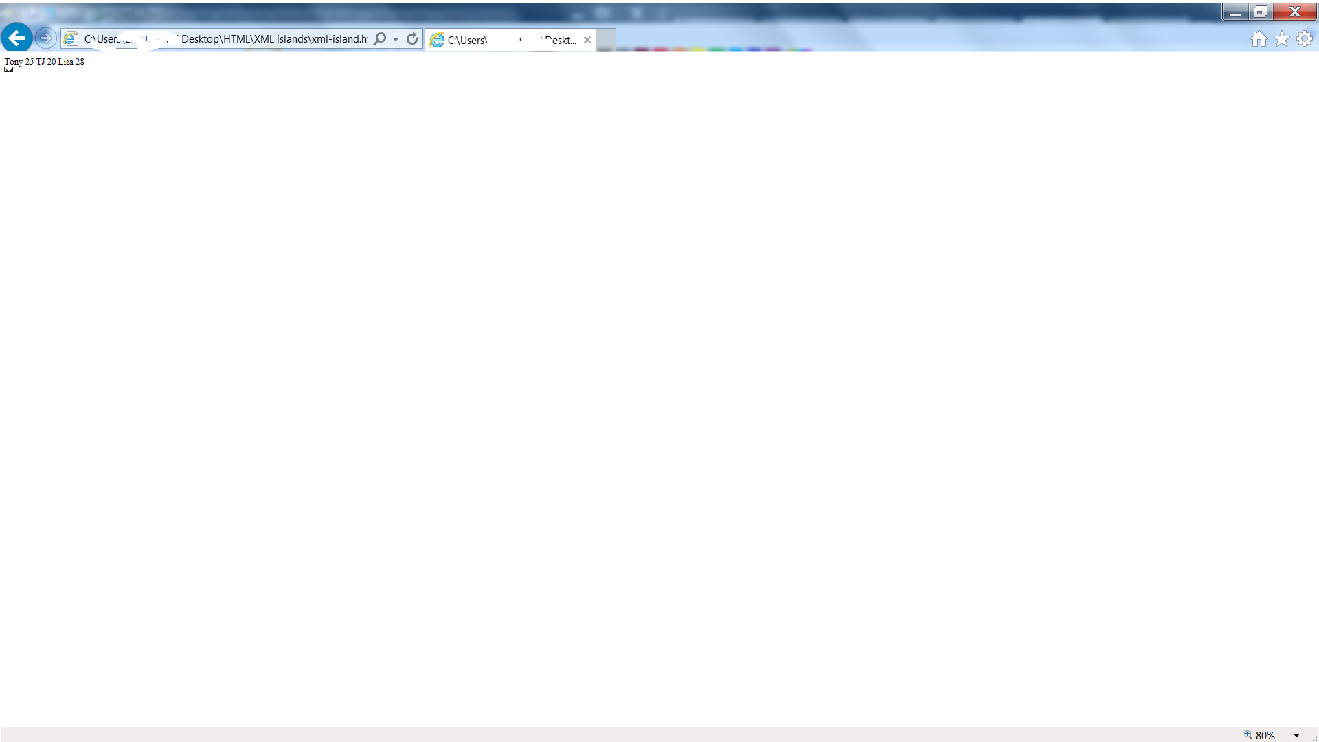基本问题是XML无效。第二个XML {person}节点具有由{/name}终止的{age}节点,该节点显然无效。它应该用{/age}终止。