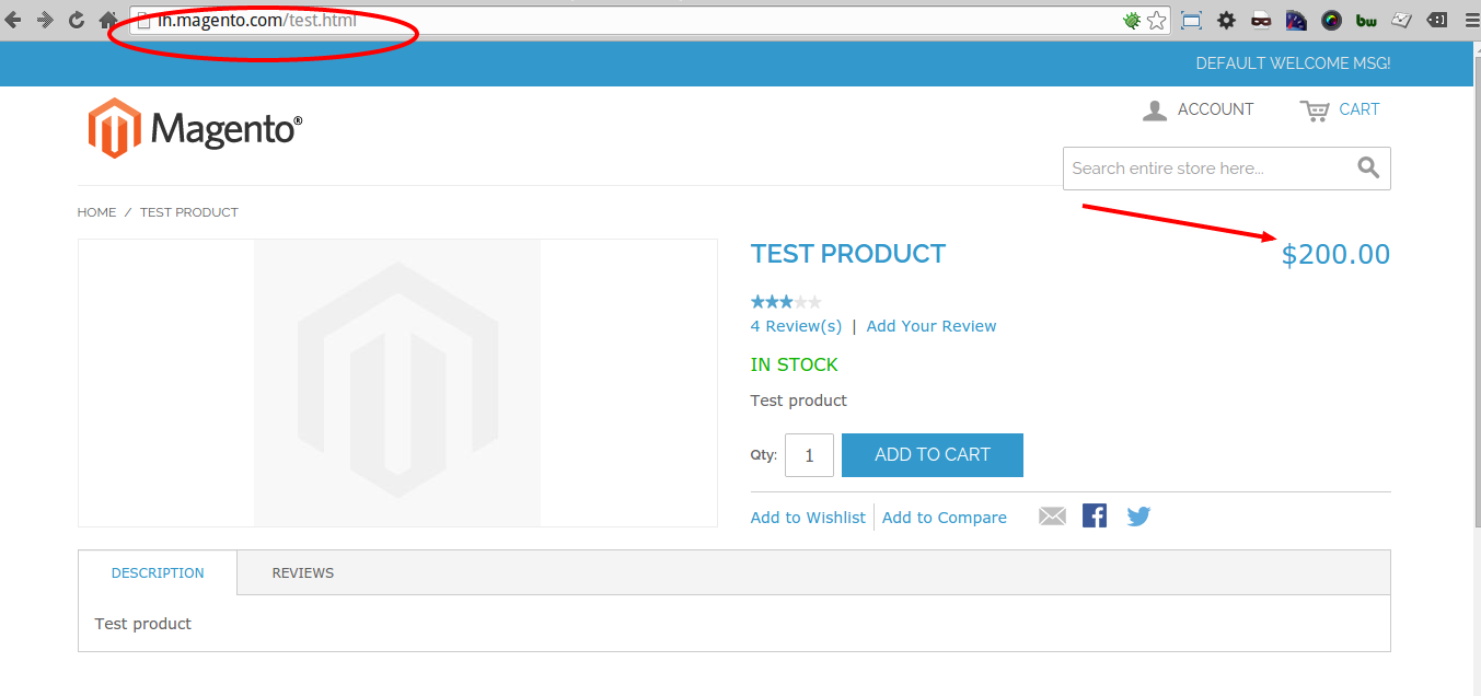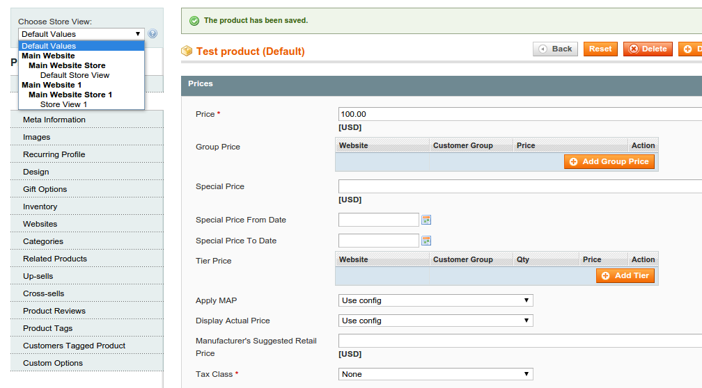 步骤4:让我们想要更改每个网站的价格,这样做改变了选择商店视图,并设置我们想要改变的商店视图。对于默认的Store视图,让它将价格更改为$200,然后保存并继续编辑,并将酸痛范围更改为另一个商店视图,并将价格更改为$250。