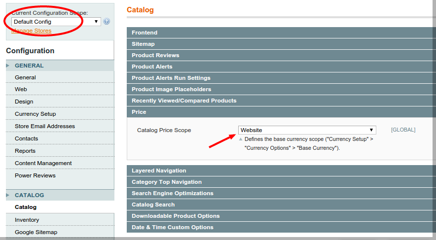 转到系统>配置>目录>价格-目录价格范围更改到网站(确保在“当前配置范围”下)