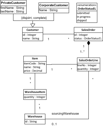 下面的模型可能比您所想的要普遍一些,因为它允许有几个仓库,可以从这些仓库中获取一个订单项目,并且它还区分了私人客户和公司客户。