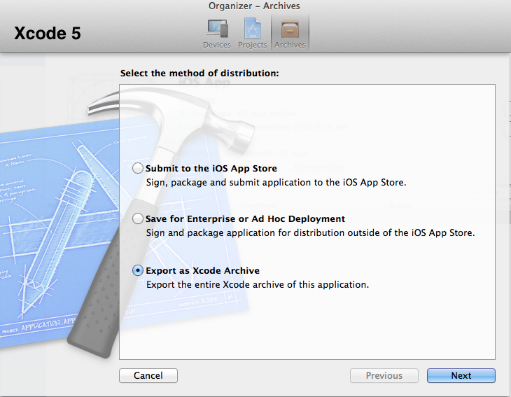 如何在Xcode 6中创建.xcarchive文件。在Xcode的早期版本中,我们可以直接从组织者导出它,但是在Xcode6中,没有从组织者导出xcarchive文件的选项。