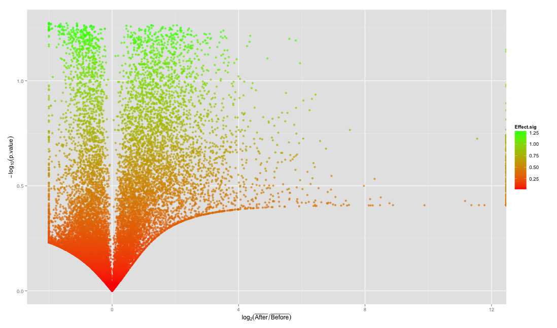 v+xlab(expression(log[2](bar(After) / bar(Before))))+ylab(expression(-log[10]("p.value"))) 发布于 2014-09-16 16:45:32