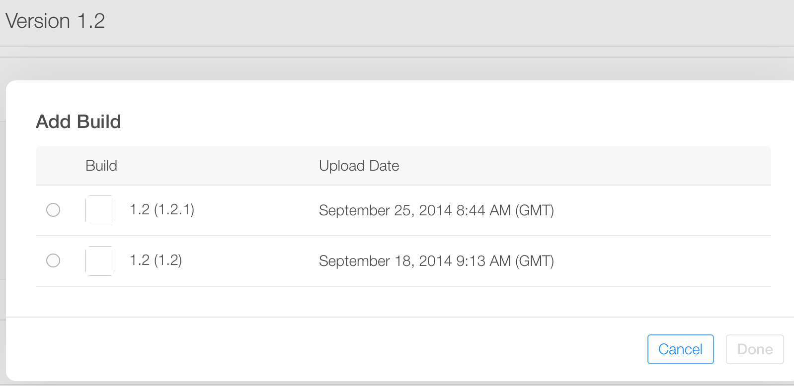 下面是在iTunesConnect中的样子(1.2是短版本号,1.2和1.2.1是包版本):