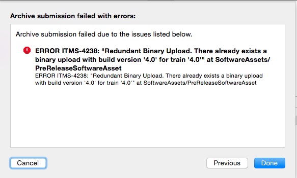 我甚至尝试将itunes连接的应用程序版本更改为1.1,然后上传1.1 (1.0),但同样的重复问题也失败了。