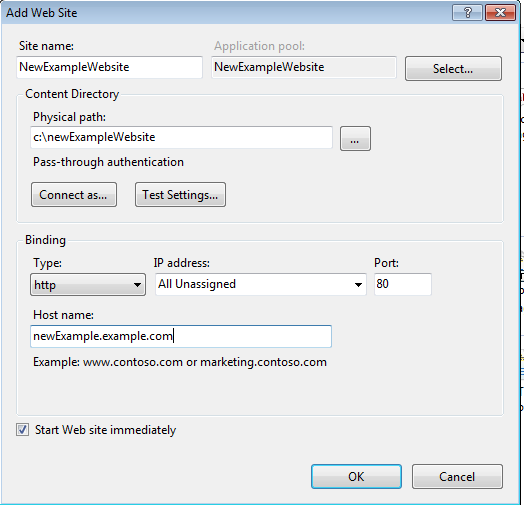 我使用宿主控制面板将子域指向IP地址,而不是11.11.11.11/newExampleWebsite。但是,为了确保在导航到newExampleWebsite时显示“newExample.example.com”,我们需要在IIS中执行以下操作。