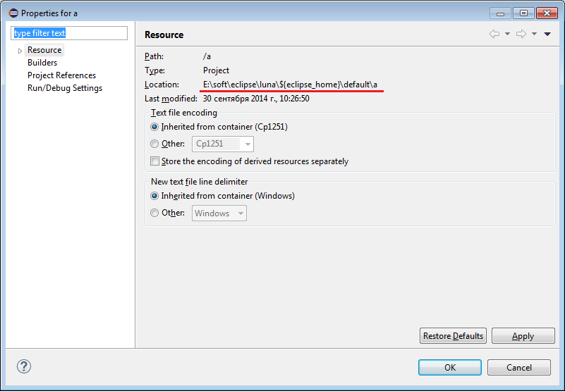 您可能想知道项目是否位于文件系统上的工作区文件夹中。为此,您可以打开项目的属性并在资源节点中查找位置: