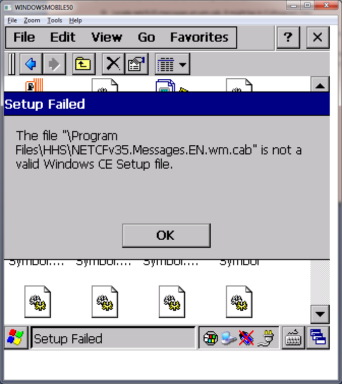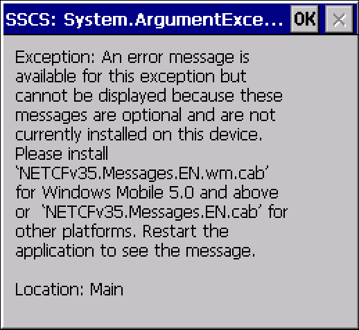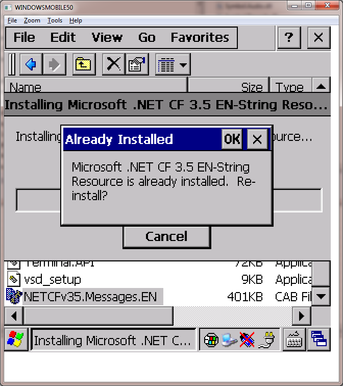 因此,我也尝试了同样的NETCFv35.Messages.EN.cab。当我在手持设备上运行它时,它告诉我它已经安装了: