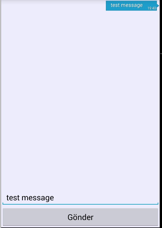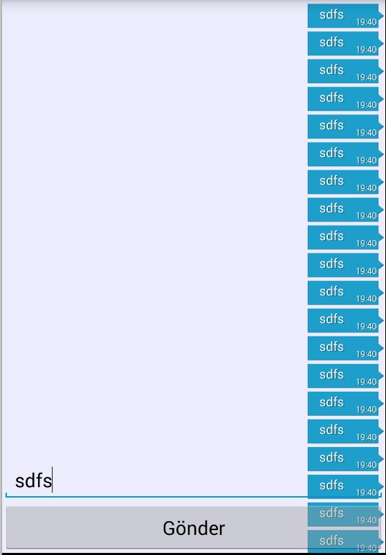 </RelativeLayout>我还有一个question.How,我可以像其他聊天应用程序一样做消息列表系统吗?我的意思是,当我将这个消息发送到列表的底部,而不是我的xml中的top.Now时,它会把这个消息放在top.Like上: