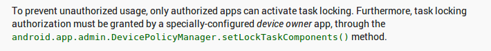 我试着用我的设备(Nexus 7)运行Android预览版。然后,我在data/system/中放置了一个带有包名的device_owner.xml。但是它仍然不起作用,islockTaskPermited()返回false,而调用startLockTask()则什么也不做。