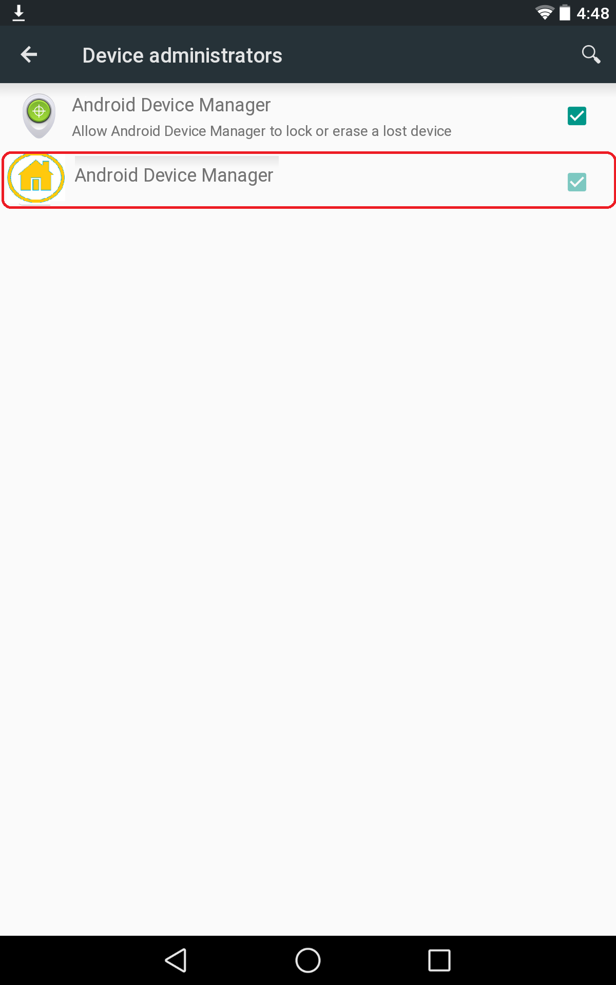 当您的应用程序是设备所有者,您的应用程序是设备管理员选项将被选中,复选框将灰色,因此将不允许您取消复选框。