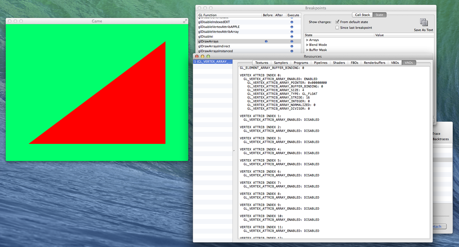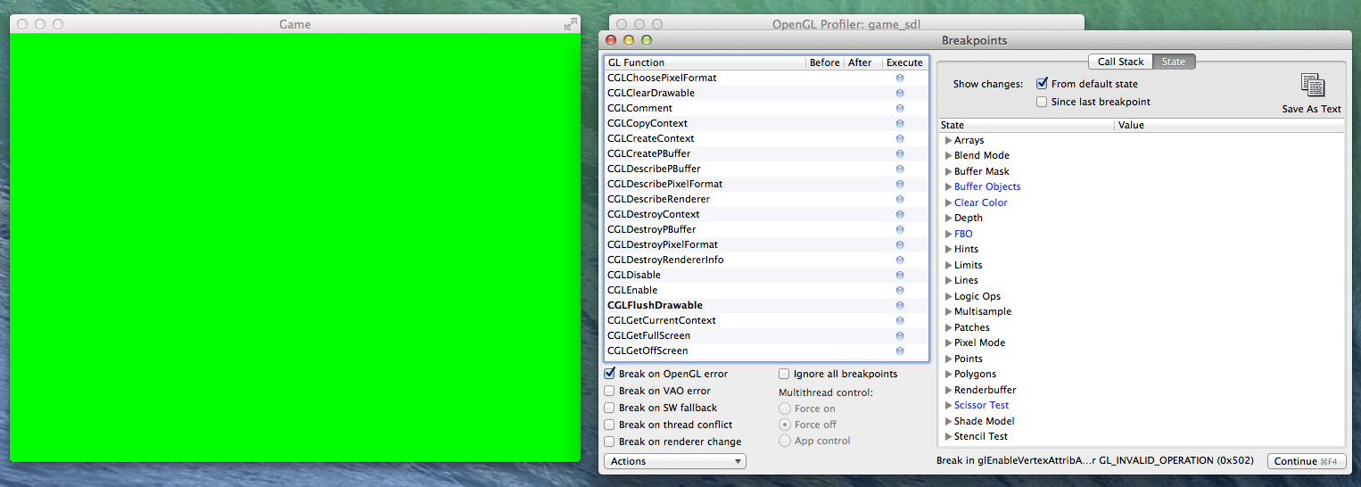 我用SDL窗口编写了一个OpenGL应用程序。在MacOSX10.9上运行OpenGL 4.1的核心配置文件。命令glClearColor工作得很好,我在屏幕上得到了正确的颜色。但是在我的呈现器中,每次执行命令glEnableVertexAttribArray和glDrawArrays时,我都会得到glEnableVertexAttribArray错误。