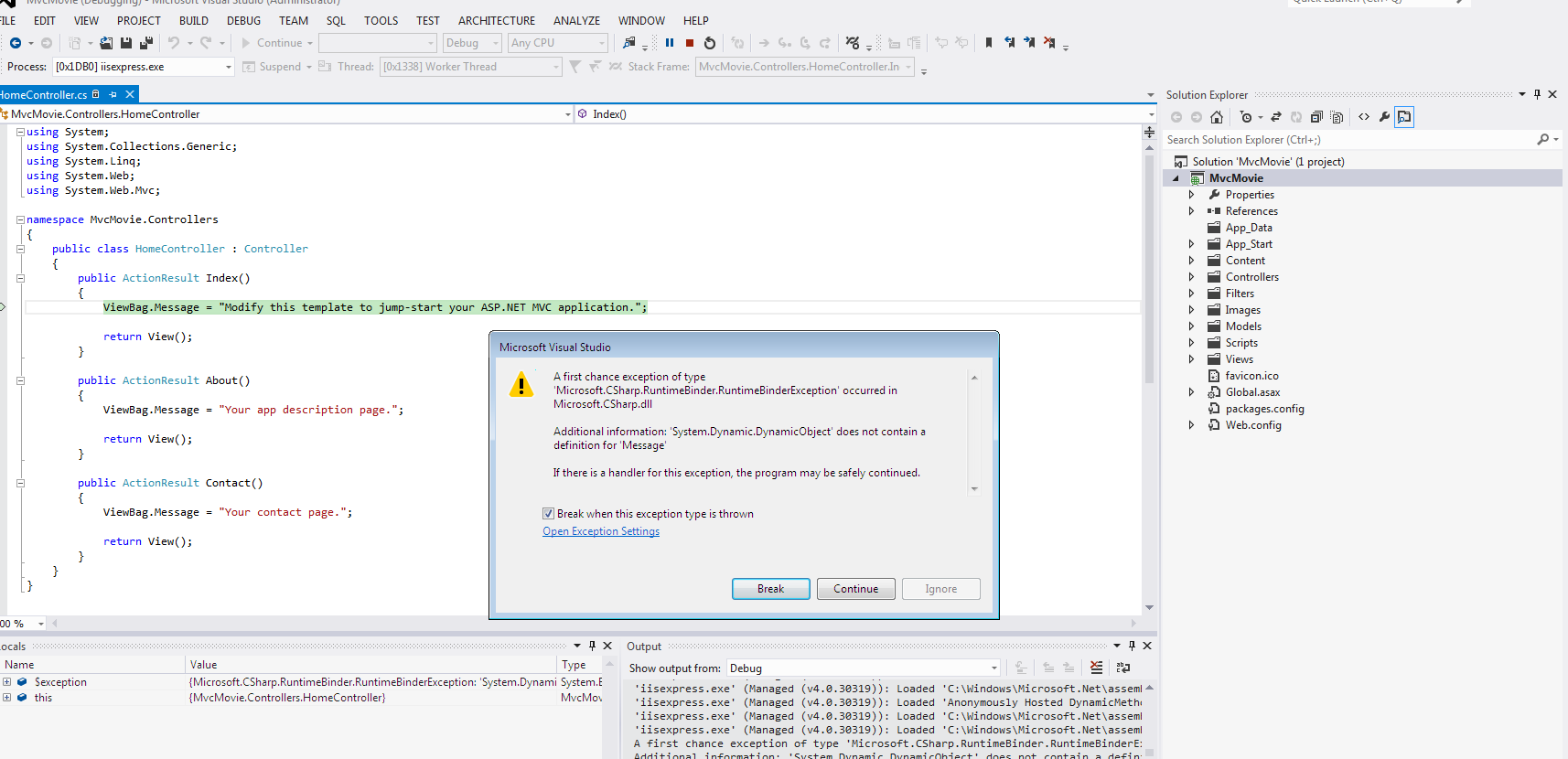 我基本上什么都没做。刚刚打开Visual 2012(终极版)。创建了新的ASP.NET MVC 4 web应用程序(使用Razor )。单击绿色"Run“按钮--但当它启动时,像这样的异常将显示在”输出“窗口中:
