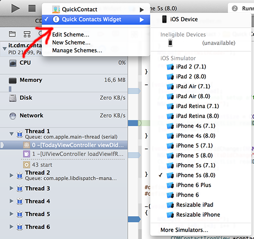 当您添加应用程序扩展目标时,Xcode还应该为扩展添加一个新的方案(或者您可以在“管理方案.”中创建一个扩展方案)。如果发生这种情况,您只需更改活动方案,在下拉列表的左侧选择模拟器的设备/os,然后运行。