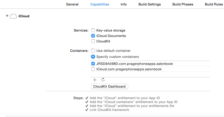 我试图跟随苹果公司使用iCloud的Sqlite来增加设备间的CoreData共享。我使用的是一本过时的手册(2014-07-15),第8-9页展示了如何在现有的应用程序中启用iCloud;然而,示例是针对文档,而不是针对SQLite,而当试图启用SQLite时,图像与XCode 6不同步。