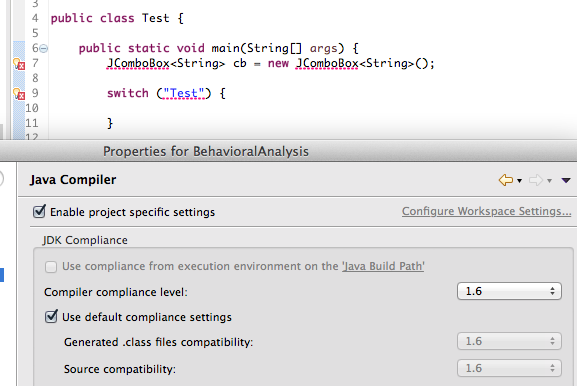 我的假设是,Eclipse正在确定哪些Java 7语言特性与Java 6 JVM兼容,哪些不兼容。例如,泛型类型JComboBox只是一个编译(而不是运行时)特性,所以我可以想象它是如何兼容的。虽然我认为开关字符串特性可能会造成字节代码的差异,并依赖于新的JVM特性,但我可能错了……
