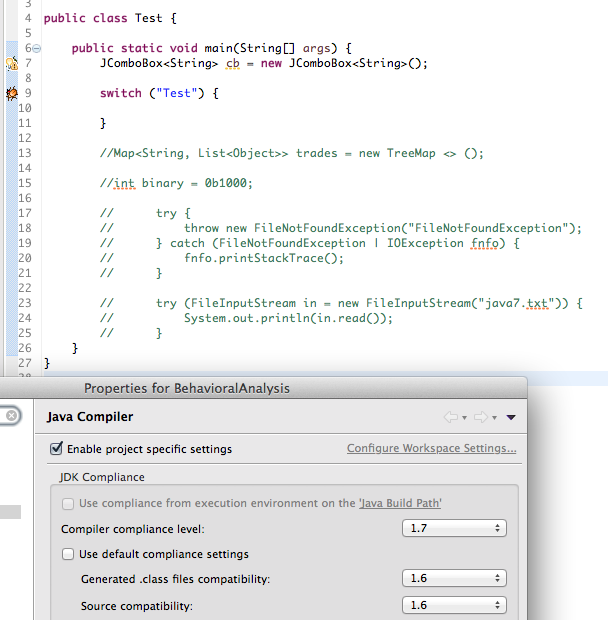 我发现在Eclipse (使用Eclipse编译器)中,我可以使用一些Java 7语言特性,但仍然可以创建Java 6类文件。在下面的图像中,您可以看到成功编译为Java 6类文件的两个Java 7语言特性。但是,那些注释掉的其他Java 7特性并不编译。