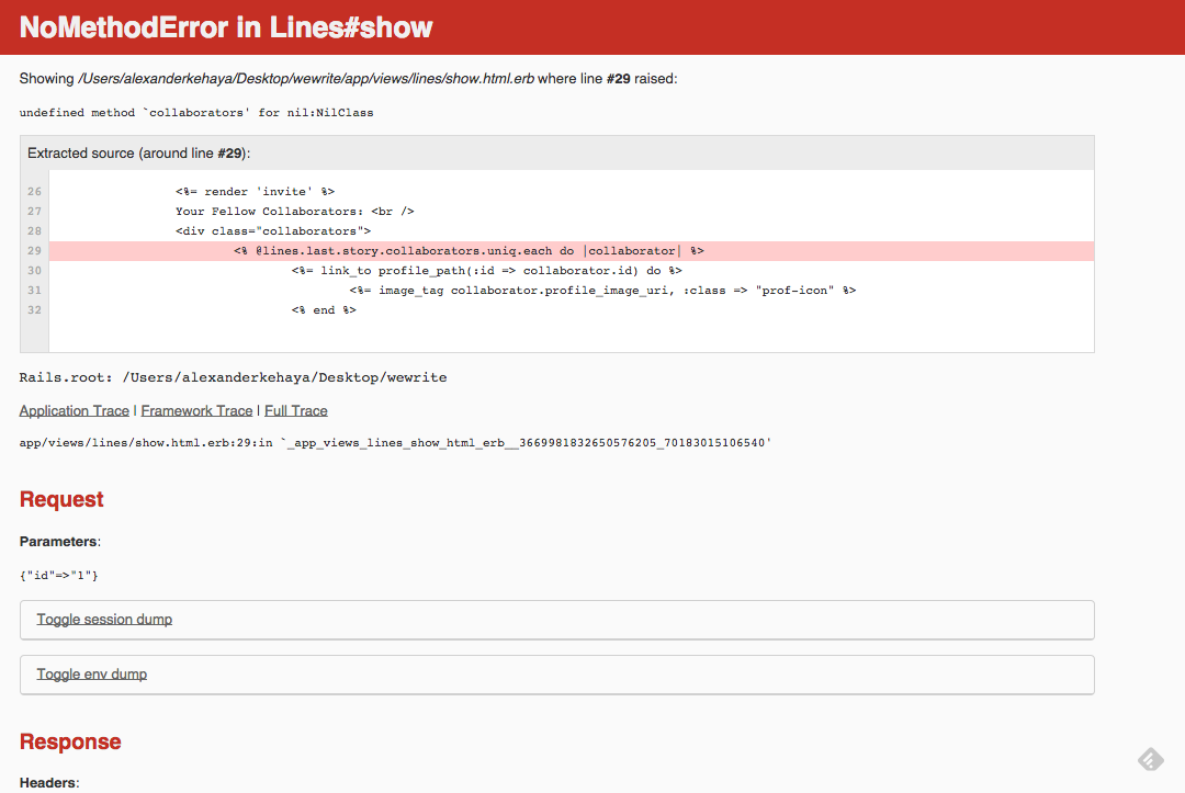 我的rails应用程序中出现了这个错误。我认为,当我创建一个新的行或开始一个故事,它不会自动添加到一个故事对象。我列出了我的show.html.erb文件和行controller.rb文件。
