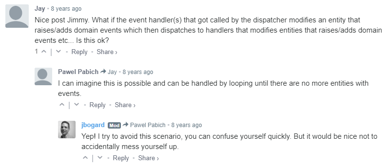 不要忘记,在执行应用程序的架构时,Domain是一种高级模式,它不仅仅是处理对象事件的另一种方式(比如C#的事件)。