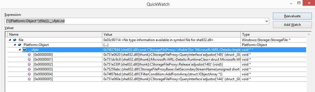 当然很难理解。你所看到的是一个代理。它是一个COM术语,是一个COM对象的包装器,这些对象不是线程安全的,也不是存在于另一个进程或机器中的。代理实现驻留在proxy 32.dll中,因此出现了混乱的诊断消息。您根本看不到实际的对象,访问它的属性需要调用代理方法。调试器无法执行的一些事情,代理将调用从一个线程封送到另一个线程,另一个线程被冻结,而调试器中断是活动的。