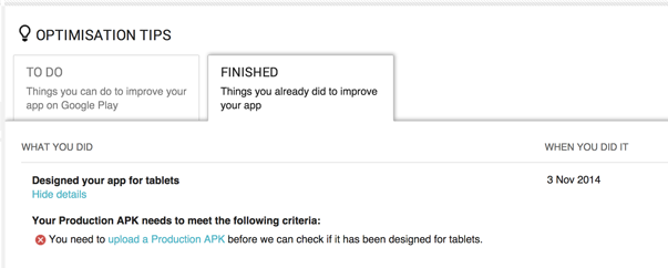 同样奇怪的是,Google Play商店没有提供平板电脑优化的优化提示,但告诉我平板电脑优化已经完成(通过将应用程序从Alpha测试状态推广到生产)。